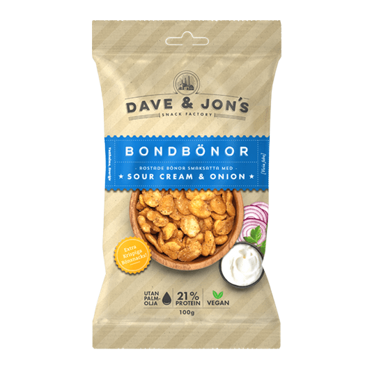 Ristede bondebønner creme fraiche & løg 100 g er en vegansk rigtig god bønne med smag af creme fraiche & løg, der er både velsmagende og sprød, perfekt som snack.