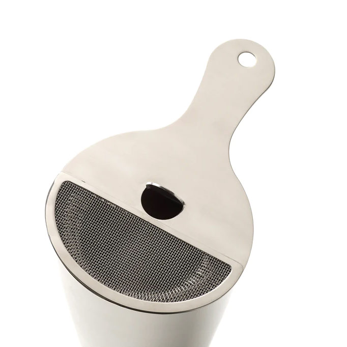Urban Bar Biloxi Double Strainer, hvormed du både fint og standard kan si dine cocktails til drinks. Når den stilles mod shakeren, fungerer den som en almindelig hagtornsi men kan så skubbes frem, så det fine net dækker kanten af shakeren og man kan finessere alle de små rester af frugtkød og krydderier mm.