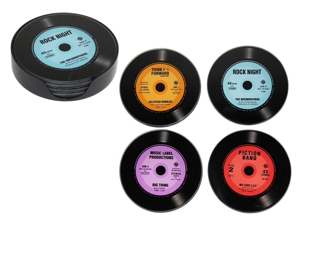 Coasters vinylplade glas 4-pak med en vidunderlig retro følelse. Disse coastere er lavet af glas og designet som små LP'er med 4 forskellige motiver og er perfekte til drinks, cocktails, vinglas og ølglas.