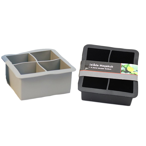 Isform mega i silikone hvor du laver 4 isterninger med en størrelse på 4,5 x 4,5 cm, rigtig store isterninger til at bruge til juice, sodavand, vand eller drikken mm.