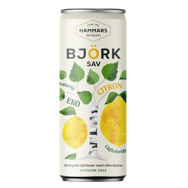 Birkesaft citron 25 cl fra Hammars Bryggeri, som er en økologisk drik lavet af saft fra birk smagt til med økologisk juice og lidt, lidt økologisk sukker og kulsyre.
