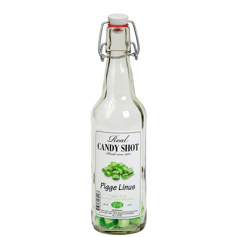 Real Candy Shot med smag af den klassiske is Piggelin. Candyshot Piggelin er et klassisk designet slikshot med prikker med smag af citrus og pære i bunden, der opløses i alkohol, du selv tilsætter. En populær måde at lave en rigtig lækker slikshot. Flasken rummer 50 cl og har en smart patenthætte, der kan genlukkes.
