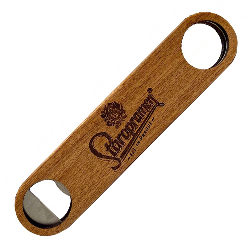 Staropramen Barblade kapselåbner i træ med Staropramen-logoet trykt på siden. En rigtig fin og smuk øloplukker til at bruge til at åbne din øl med stil.