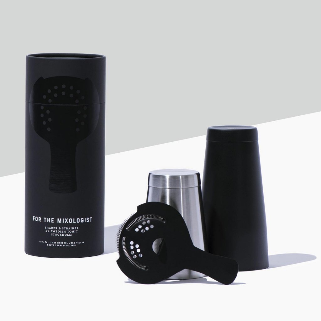 Swedish Tonic - Shaker og cocktailsil. Swedish Tonic Cocktails shaker og sil er lavet af børstet rustfrit stål. Den nederste del af shaker og sil er belagt med sort maling af højeste kvalitet.