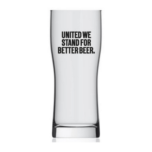 På forsiden af glasset er Brewdog-logoet trykt og på bagsiden er teksten 'United we stand for better beer' trykt.