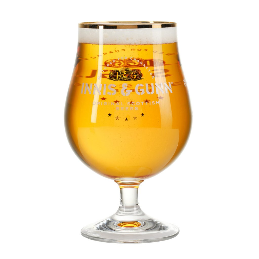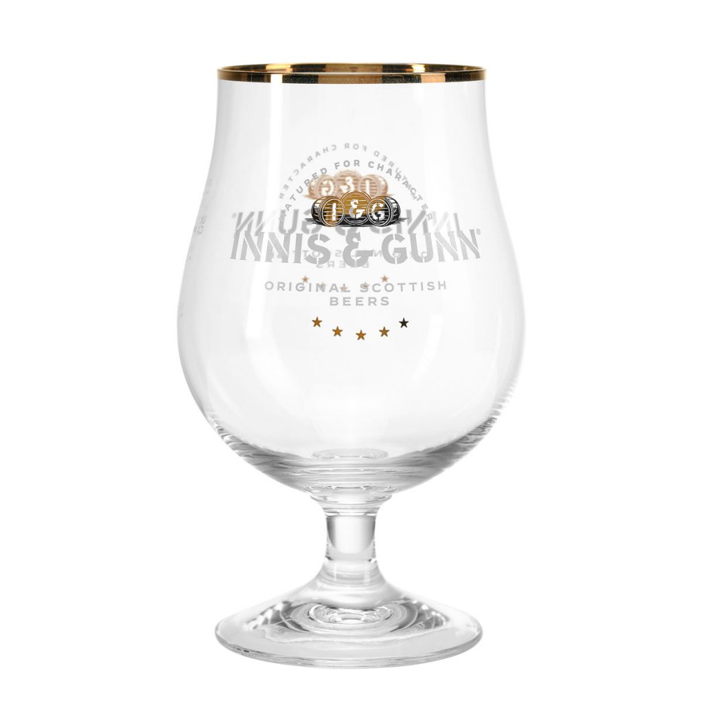 Half Pint Innis & Gunn ølglas. Den berømte egetræsfadlagrede øl fra Skotland, Innis & Gunn, er meget populær i Skandinavien. I et egetræsfadelager, der minder om principperne for, hvordan whiskyen ældes, skabes en unik karakter. Dette ølglas er kopformet, hviler på en flot fod og har en let kupning i toppen. Innis & Gunn-logoet er trykt på forsiden af ​​ølglasset.
