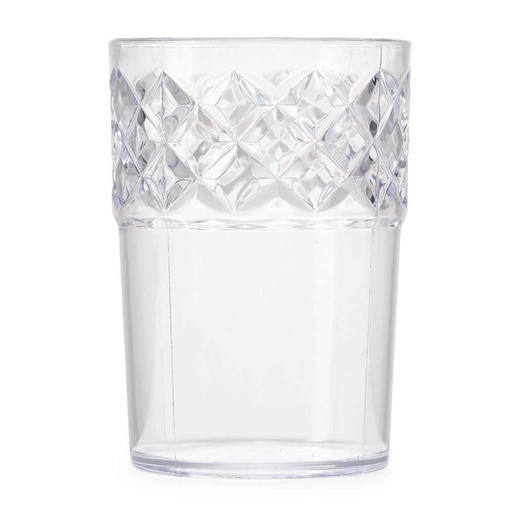 Plastikglas krystalklar 35 cl i retro design med skåret plast i overdelen, der minder om diamanter. Et rigtig lækkert glas at servere enhver drink fra.