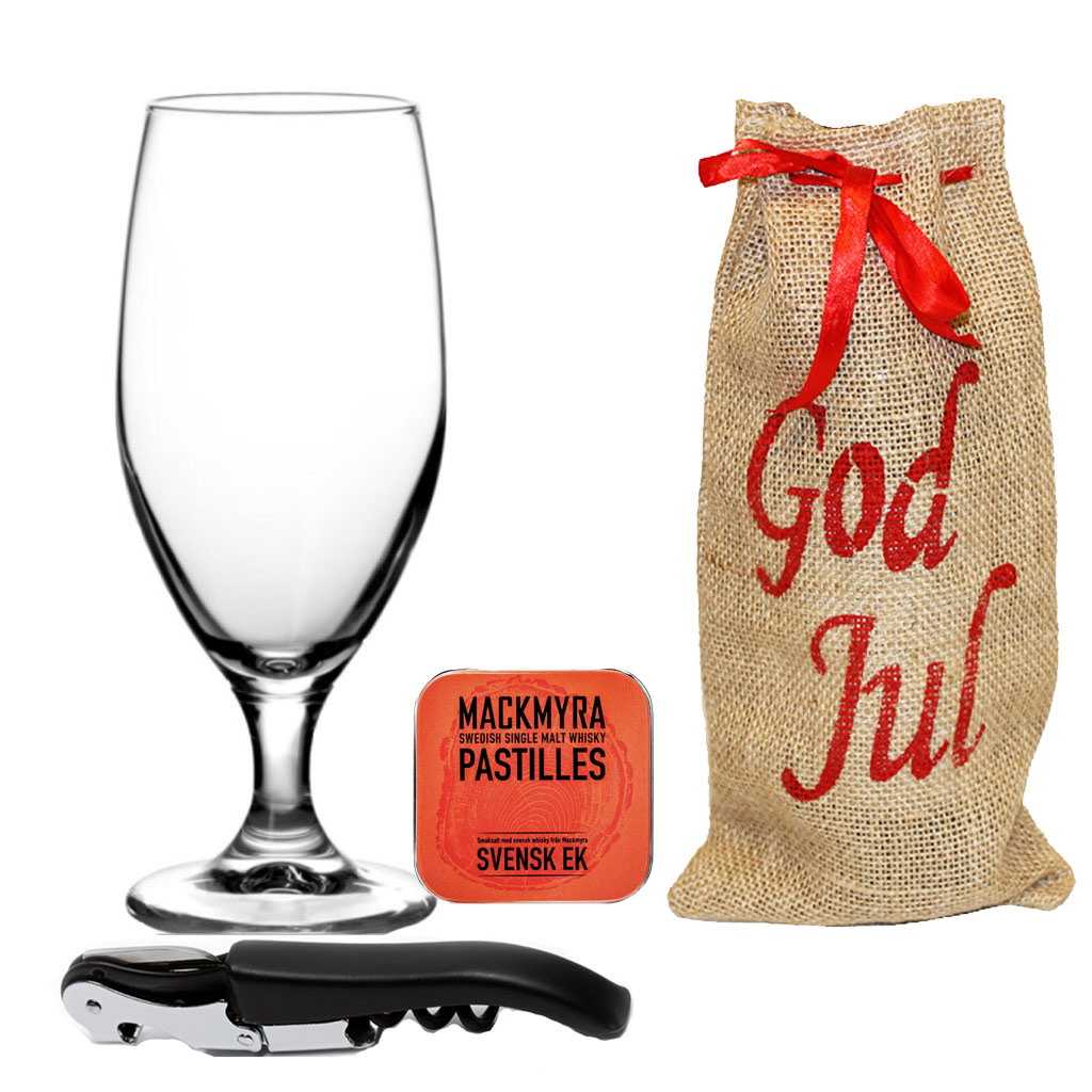 Juletaske i sækkelærred med rødt bånd, der indeholder dåseåbner, pastiller fra Mackmyra og et stilrent ølglas på fod fra tyske Sahm. Et klassisk designet ølglas, der er velegnet til alle typer øl. Perfekt julegave til alle, der kan lide øl!