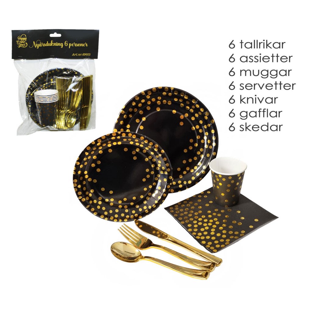 Nytårsborddækning til 6 personer, som omfatter tallerkener, tallerkener, krus, servietter, knive, gafler og skeer, alt hvad du skal bruge til at dække bord til en fest.