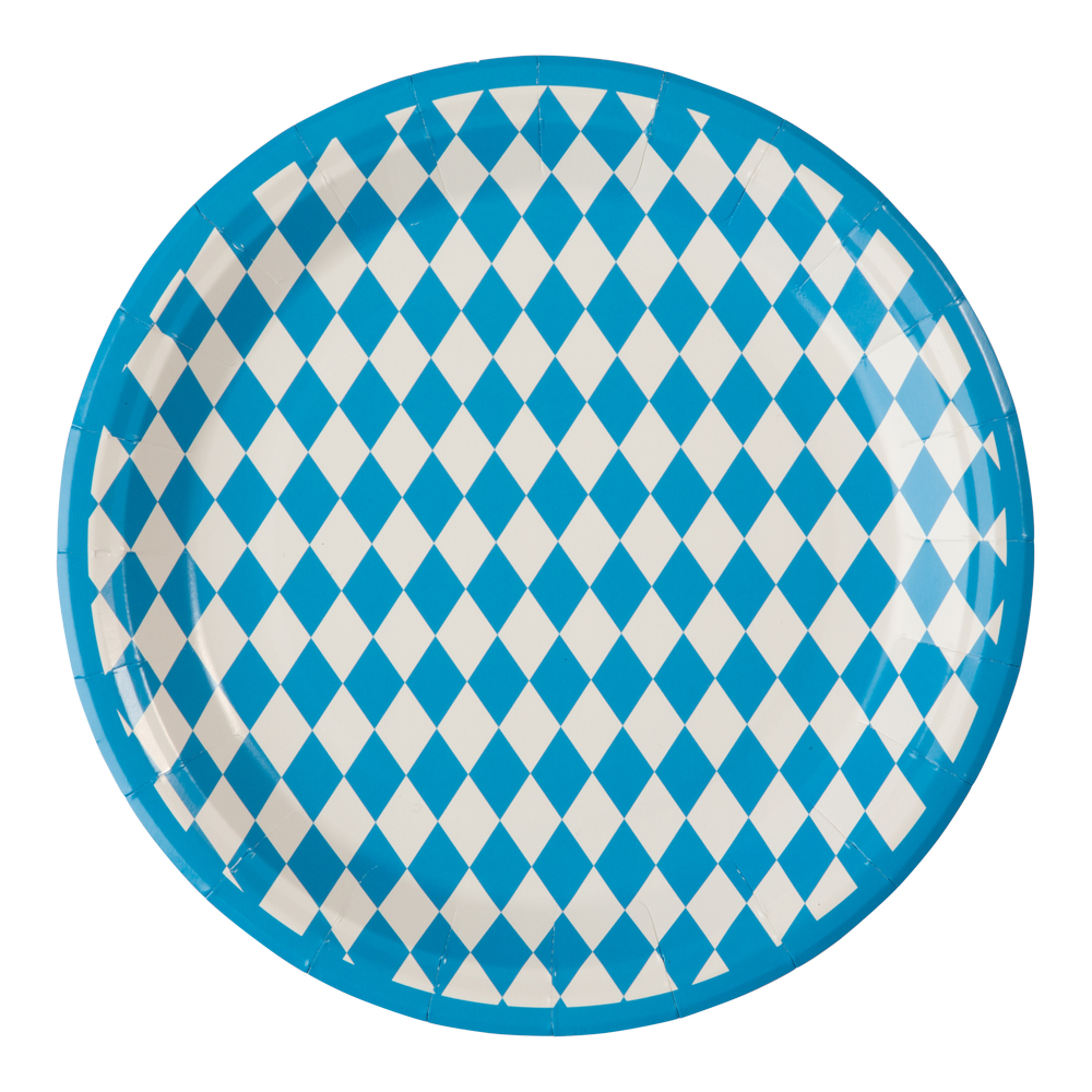 Oktoberfest papirtallerken 23 cm 6 pak. Klæd ud til Oktoberfest! En rund paptallerken med det klassiske blå og hvide mønster som baggrund.