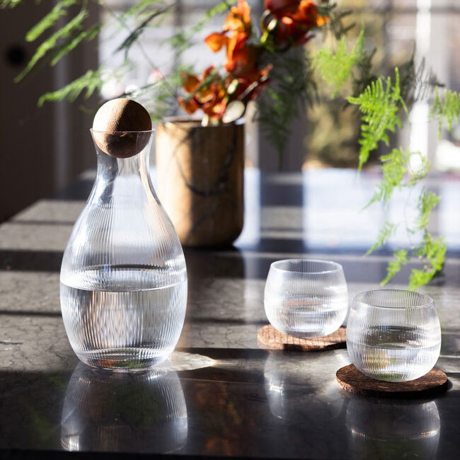 Karaffelen kan fyldes med vin, vand eller bruges som en dekorativ vase. Den smukke kugle i certificeret eg fungerer både som kork og som en stilfuld detalje og giver karaffelen en naturlig varme.